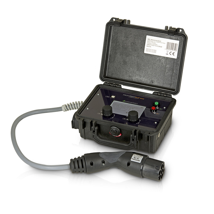 BASE 32 är utrustad med en CEE-kontakt (400 V, max 32 A), vilket gör den lämplig för laddstationer med högre effekt. Den är större än grundmodellen och passar bättre för service och R&D där kraftfullare testlast krävs.